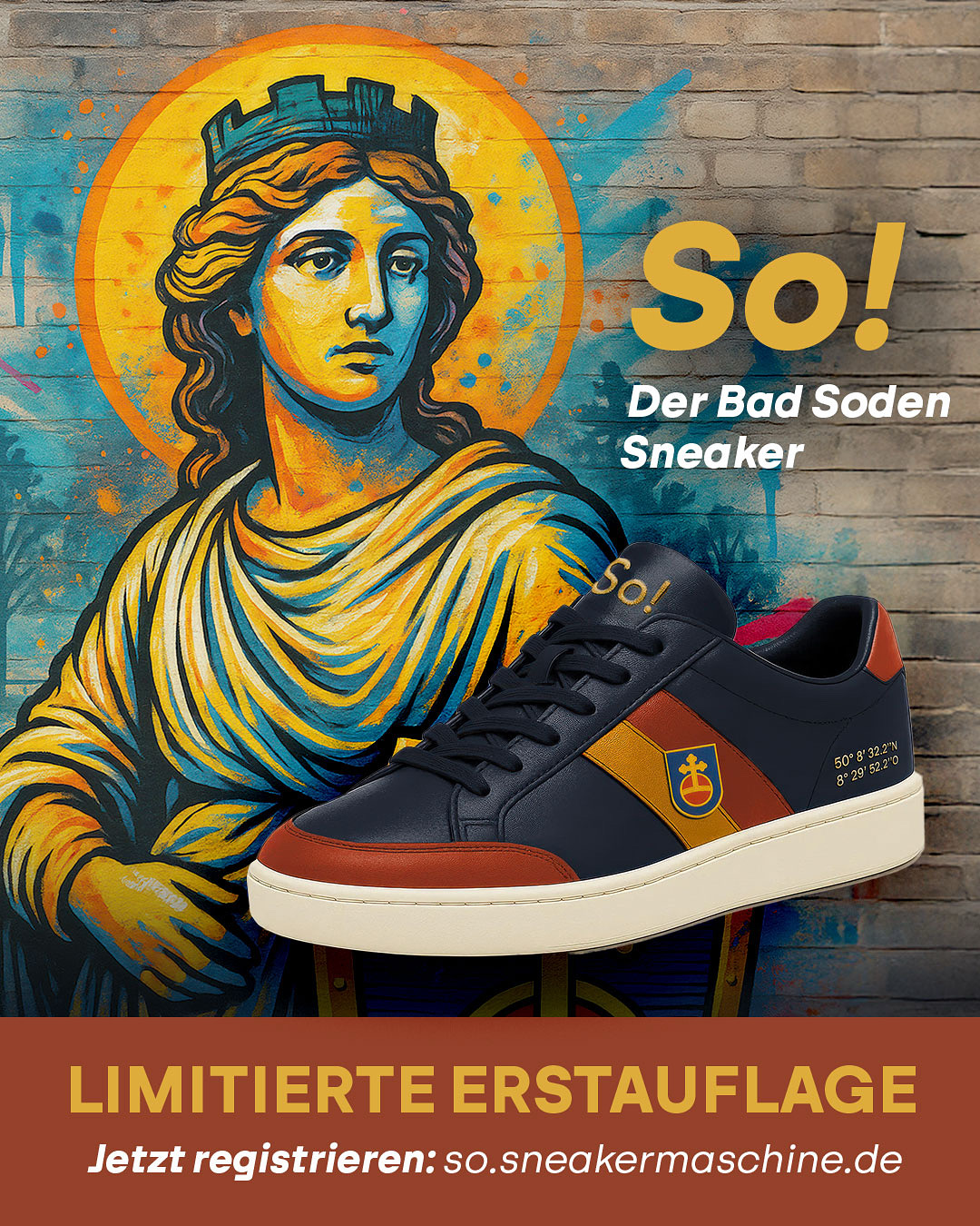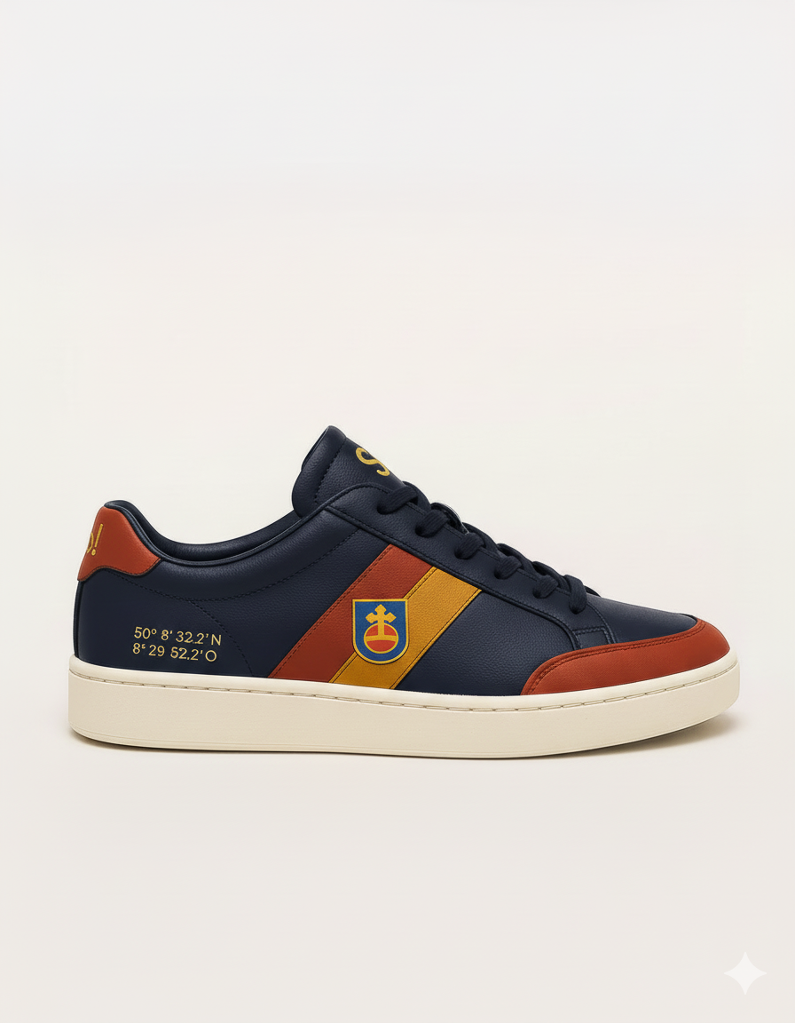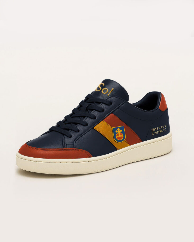 So! ist unser erster Beweis, dass die Sneaker Maschine funktioniert. Ein limitierter Court-Sneaker, in dem Bad Soden sichtbar wird: Farben, Koordinaten, Wappen.